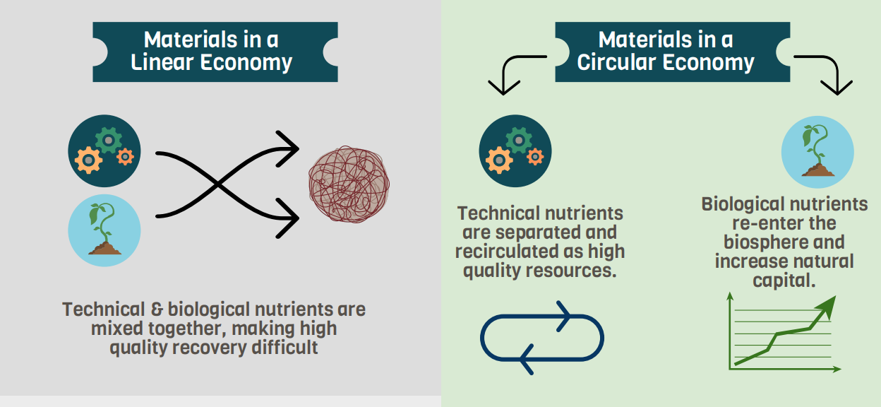 As to be expected, material use in a circular and linear economy look different. The RCBC explains that technical and biological nutrients perform better if they are separated out and thus made accessible for reuse and redistribution in their own discrete forms. In a linear economy technical and biological materials are often combined, which makes high quality recovery difficult (RCBC). Everything is mixed up and it is harder to extract elements for reuse. In a circular economy technical materials are separated and easier to be recirculated, retaining their value as high quality materials (RCBC). The biological material in the circular economy instead of being combined with technical material will return to the earth and offer additional regenerative value (RCBC).